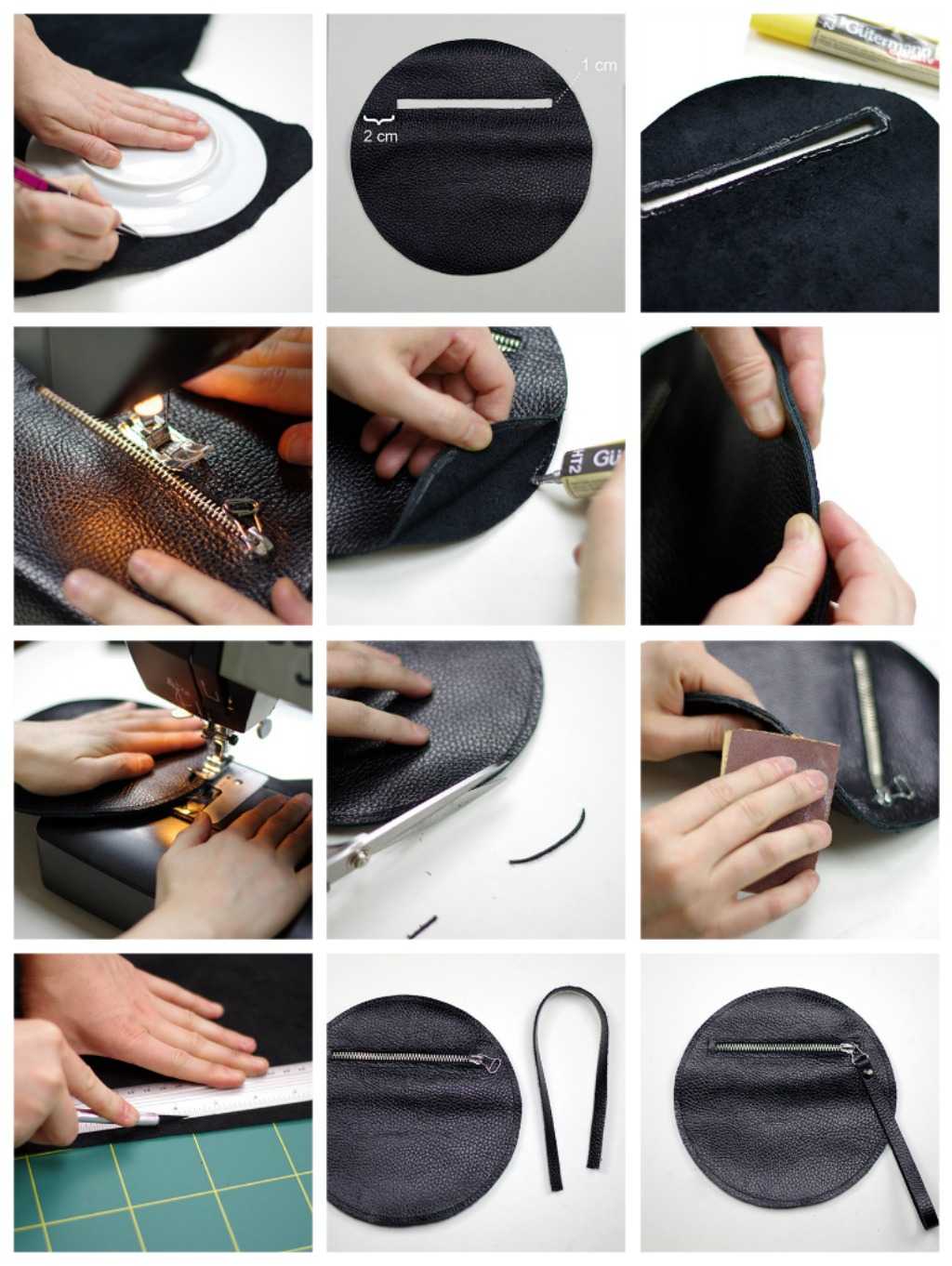 - Детали сшиваются с внутренней стороны. Для этого они складываются лицевой стороной друг к другу и делается строчка по трём сторонам. Следом пришиваются ручки и застёжка-молния.