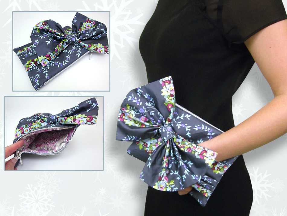 Одна из интересных моделей выполнена из цельного полотна в форме смещенной восьмерки, края которой соединяются молнией. Сложность создания такой модели клатча заключается в аккуратность пришивании молнии.