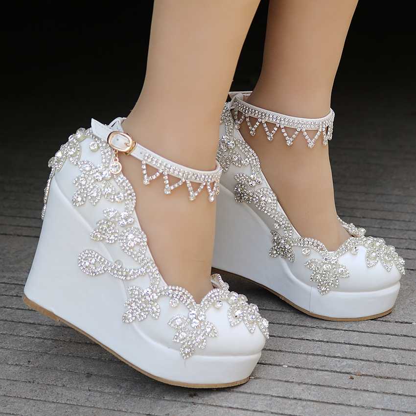 Туфли свадебные на танкетке помогут невесте ощущать себя в них более устойчиво. Если подошва высокая, стоит проследить, чтобы модель была еще и на платформе в передней части. Свадебная обувь без каблуков уже вошла в моду, принеся с собой комфорт и удобство. Она подойдет тем, кто планирует активную вечеринку, а также для торжества на природе.