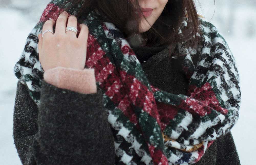 Красиво сочетаются вместе однотонные вещи и с принтованными, поэтому попробуйте решение, в котором под однотонное пальто или куртка комбинируются со снудом узором