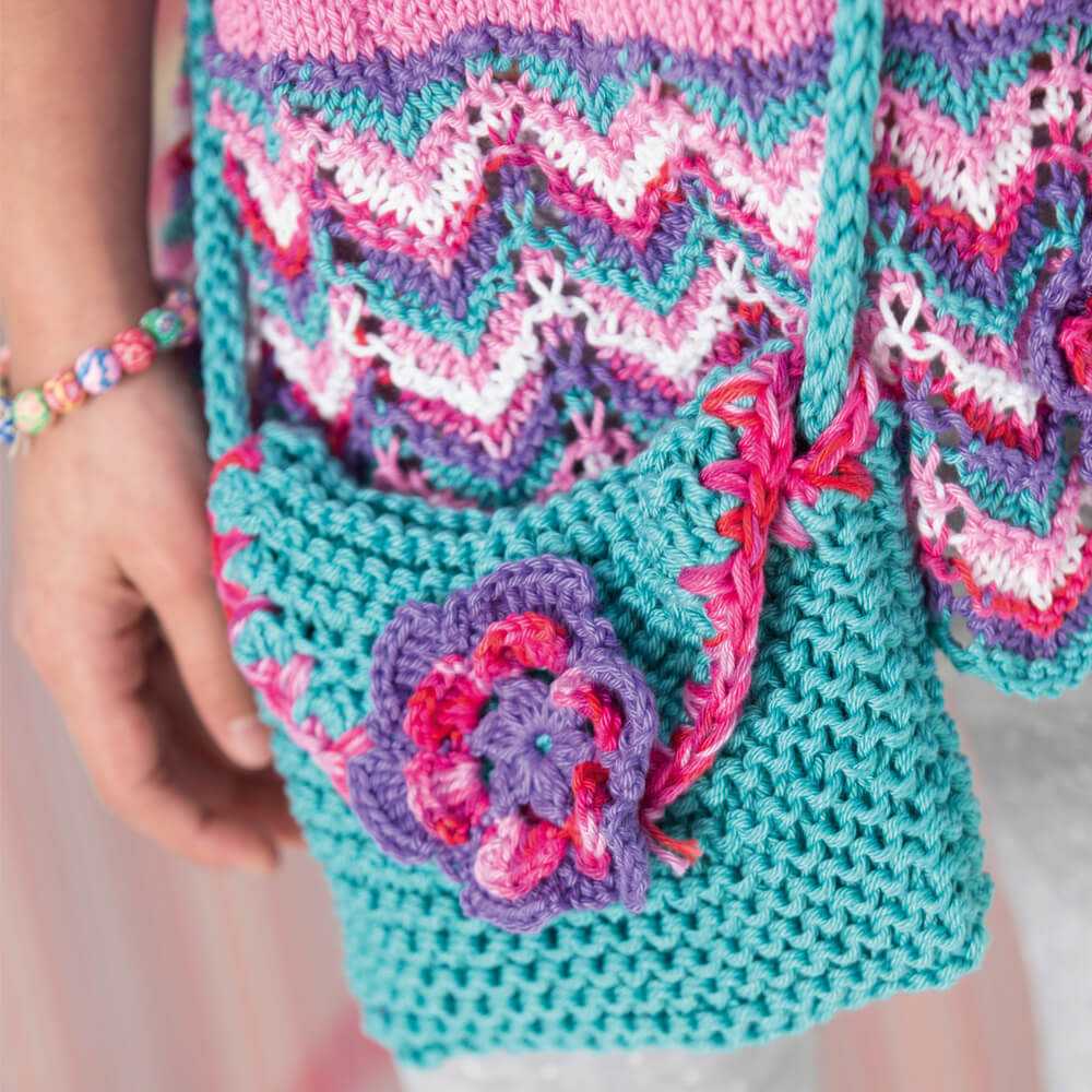 Самый популярный вариант расцветки сумочки для девочки — все оттенки розового. Но, разумеется, можно выбрать и другие варианты расцветок. Очень симпатично смотрятся сумочки с вывязанными или вышитыми узорами. А если в доме накопилось много остатков разноцветной пряжи, то маме стоит связать для своей малышки веселую радужную сумочку.