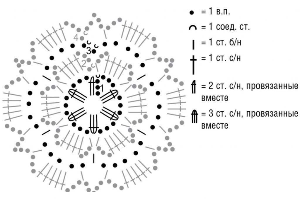 Крючком выполняем цепочку из 7 ВП и замыкаем её в кольцо СС в ВП. Сделать 4 круг. р., как на схеме: