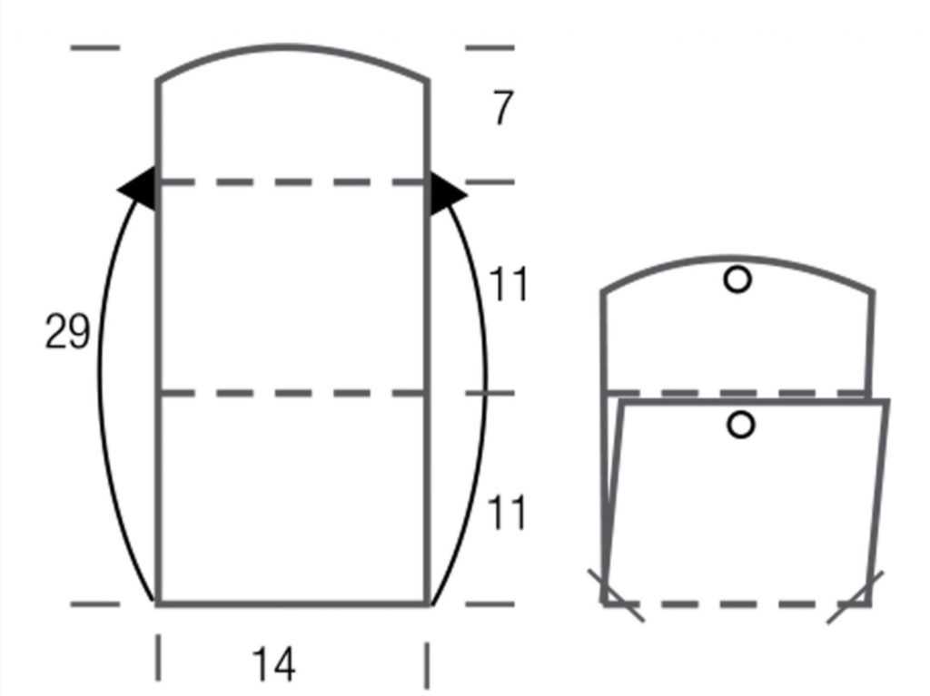 Складываем сумочку, как показано на выкройке. Сшить по изнаночной стороне толстой иглой родной ниткой. В нижних углах сделать закругления. Клапан сумки или обвязать крючком СБН, или набрать на спицы п. по всему краю клапана и вязать лиц. гладью несколько р., после чего загнуть окантовку вовнутрь и подшить иглой.