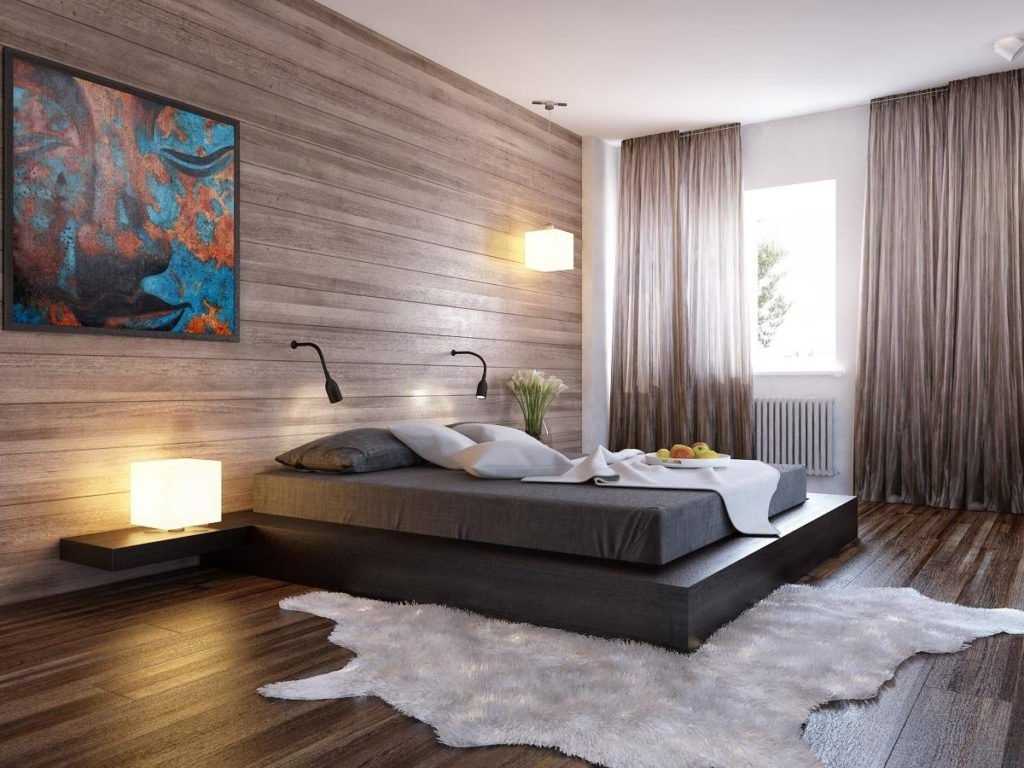 Мебель для бежевой спальни не должна сливаться с полом, стенами или ковром. Лучше, если ее цвет будет на несколько тонов темнее фона. Эффектный приём — оформление стены в изголовье деревянными отделочными материалами. Это могут быть стеновые панели, паркет из массива, ламинат.