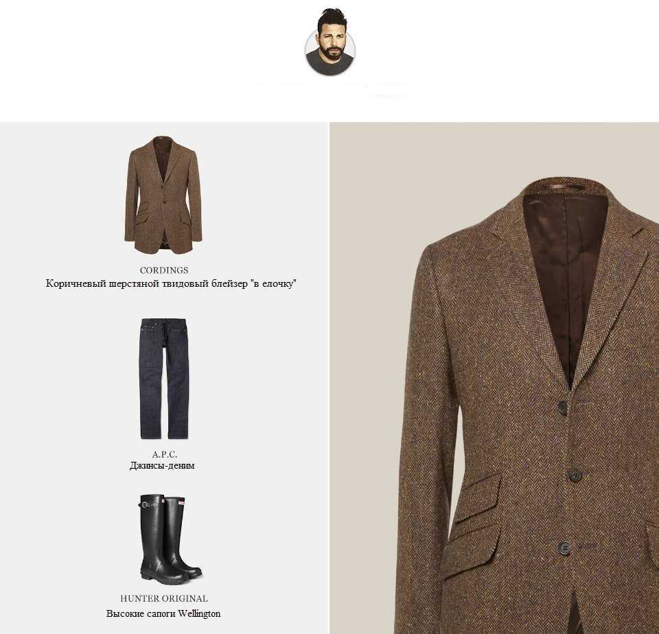 Для того, что бы смотреться частью этой атмосферы, я упакую этот блейзер «в елочку» от Cordings. Я выбрал его с синими, фиолетовыми и оранжевыми вкраплениями, которые придают ткани забавный вид. Но он достаточно повседневный, чтобы смотреться с моими любимыми джинсами от A.P.C. Беспроигрышный вариант. Пара водонепроницаемых сапогов от Hunter Original и моя верная камера Leica завершат этот образ.