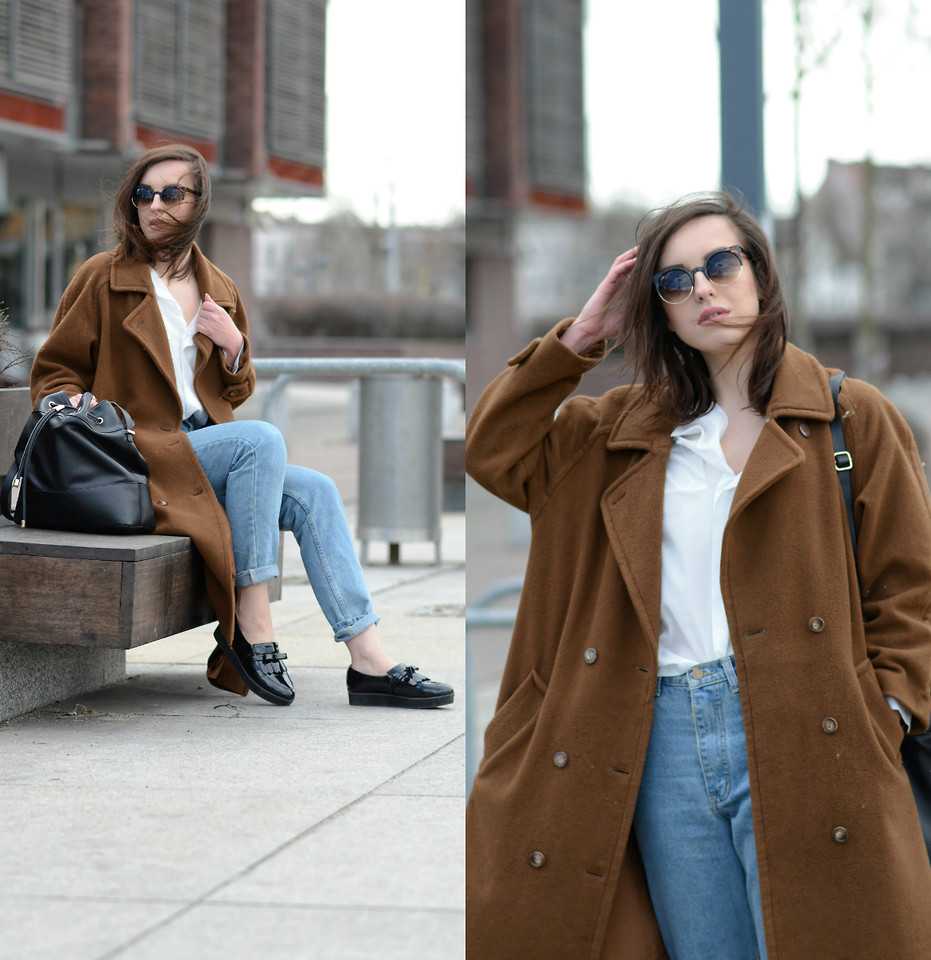 С пальто оверсайз прекрасно смотрятся туфли на устойчивом каблуке, ботильоны, сапоги-чулки, мокасины, замшевые ботинки и кроссовки.