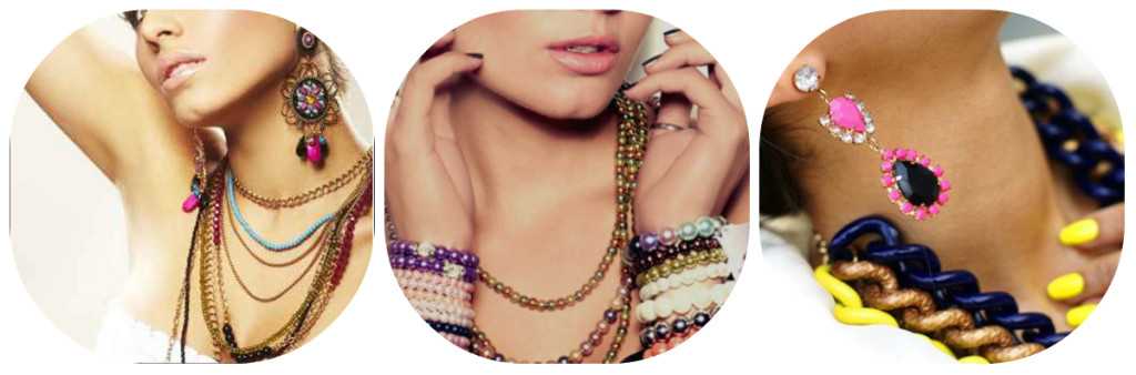 Во-первых, бижутерия не должна быть слишком цветной. Розовые цепочки, металлы зеленого цвета и детали всевозможных цветов – нет, нет и еще раз нет. Смело проходите мимо прилавков с подобными «украшательствами», вам не 5 лет.