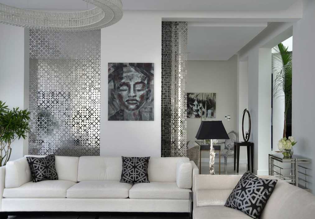 Декоративные ниши в стенах заполняют металлическими тарелками на подставках, изящными шкатулками, подсвечниками на массивных ножках, вазами с цветочным рисунком, модные глиняные кувшины и чаши. Характер высоких окон украшают черными металлическими решетками.