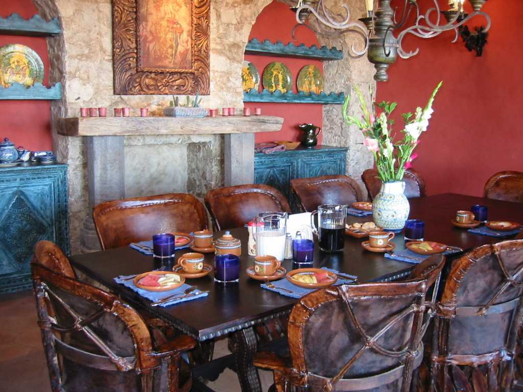 Для гостиных в мексиканском стиле характерны ковры на полу, добротная кожаная или обтянутая тканью мебель, обилие картин на стенах (в Мексике вообще не очень любят пустые пространства: при отсутствии картин стены могут завесить музыкальными инструментами, шляпами, зеркалами и тарелками, передающимися из поколения в поколение) и разномастные цветные подушки на диване (кажется, что каждая из них сделана вручную и подарена кем-нибудь из родственников).