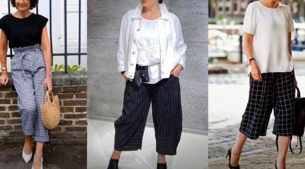 - Преимущественно старайтесь выбирать темные расцветки, если хотите казаться стройнее. Белые женские бриджи не слишком подойдут полным. Также можно скорректировать фигуру с помощью принтов — например, вертикальные полоски и орнаменты среднего размера будут делать вас визуально выше и стройнее, а вот поперечные полосы, клетка, мелкие и излишне крупные принты полным выбирать не стоит.