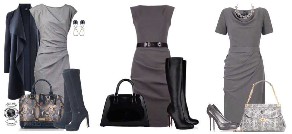 Компаньонов серому платью нужно подбирать в зависимости от того, куда вы планируете его надеть.