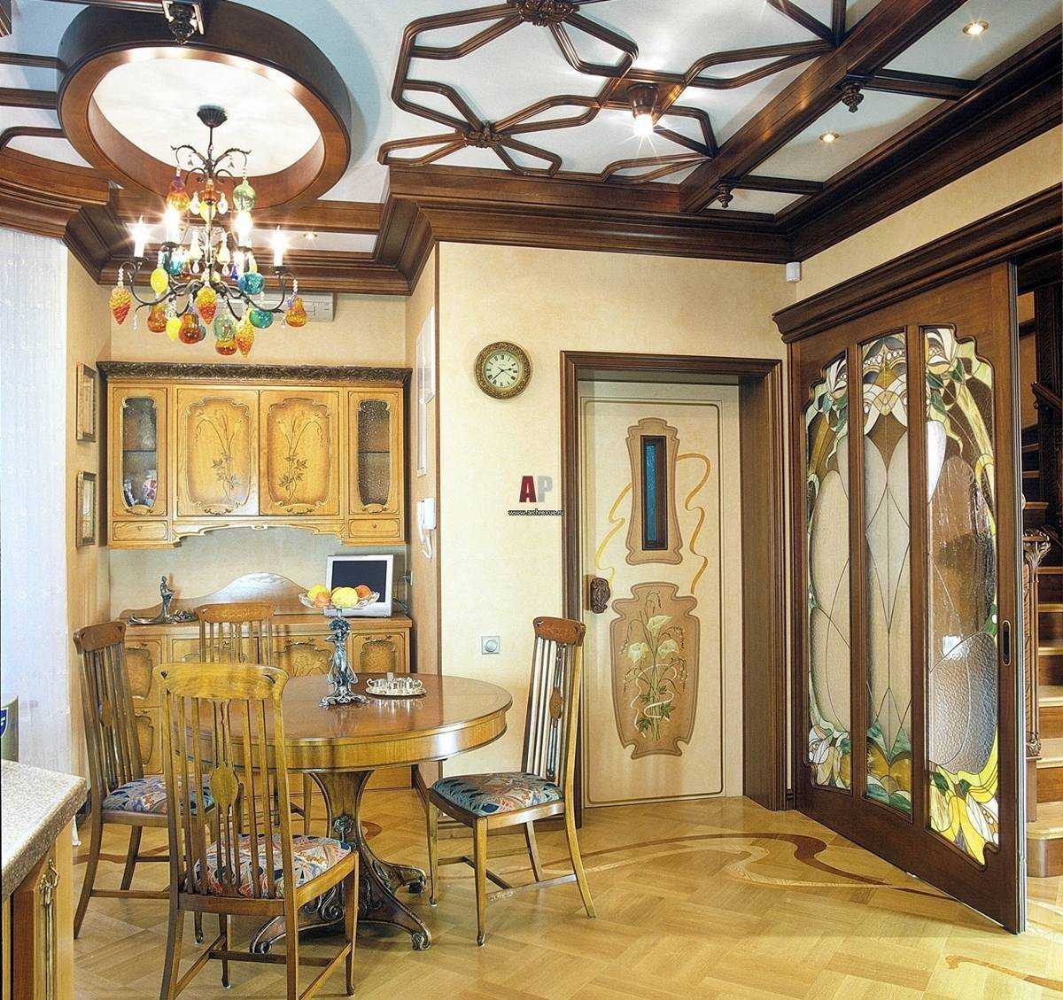Межкомнатные двери в интерьерах art-deco рекомендуется устанавливать из натуральной древесины, с филёнками, стеклянными вставками или витражами с мифическими сюжетами. Дверные проёмы могут быть открытыми, оформленными полуколоннами с акантами и позолотой.