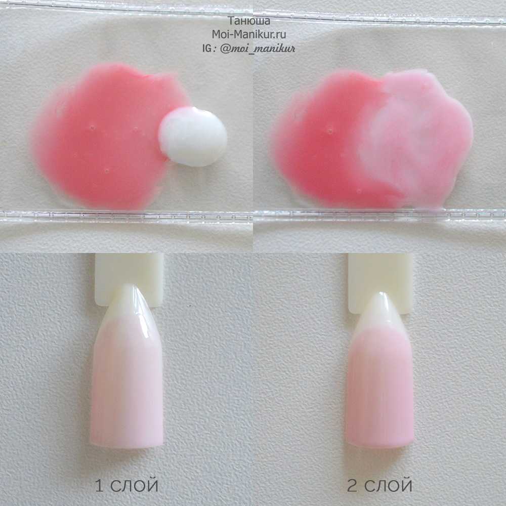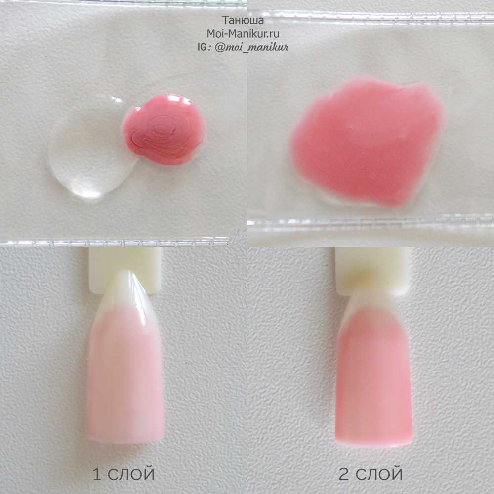 Если после прочтения этой статьи вам срочно нужна камуфлирующая база, а дома есть только обычная и цветные гель-лаки, то можно поэкспериментировать и сделать ее из имеющихся пастельных, бежевых или розовых оттенков гель-лака и простой прозрачной основы.
