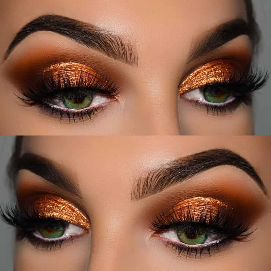 - Медные тени – у изумрудных и каре зелёных очей можно подчеркнуть глубину и выразительность взгляда. Можно у внешнего уголка глаза сделать тон более насыщенным, а у внутреннего – светлее и легче.