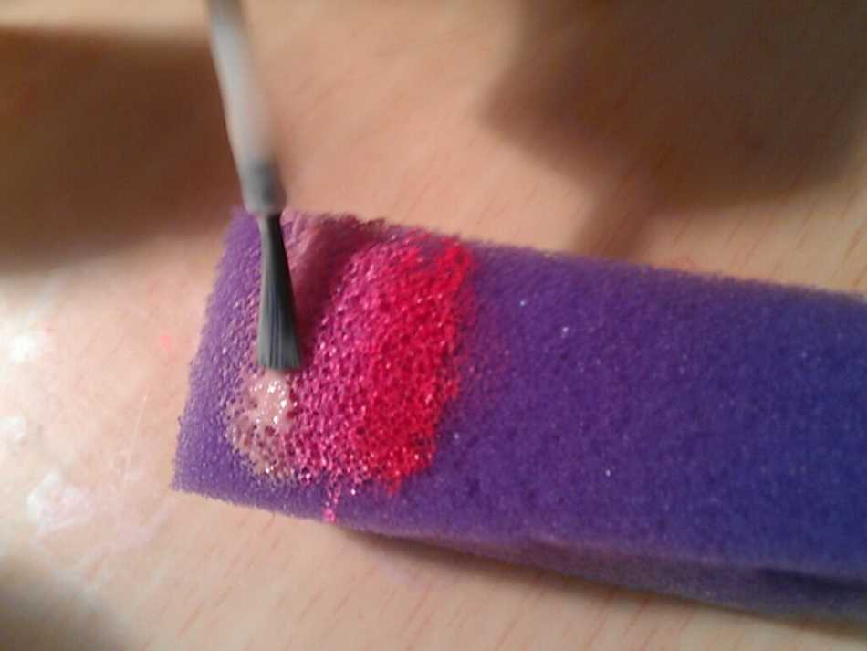 - Нанести на губку последовательный рисунок лаками разных цветов (на губку потребуется большее количество лака чем на ноготь, так как она пористая).