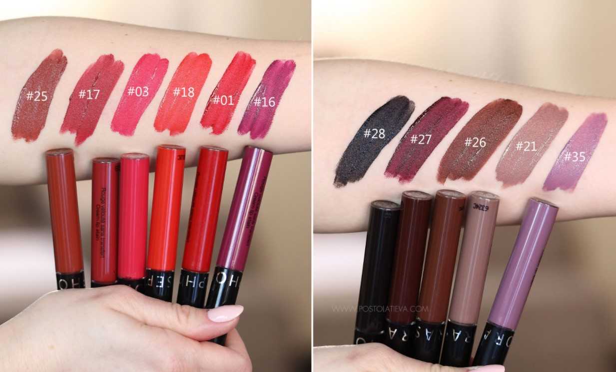 Здесь собраны всевозможные цвета, от бежевого до красного, вишневого и шоколадного. Цвета на губах смотрятся как в каталоге, поэтому можно смело делать выбор по фото.