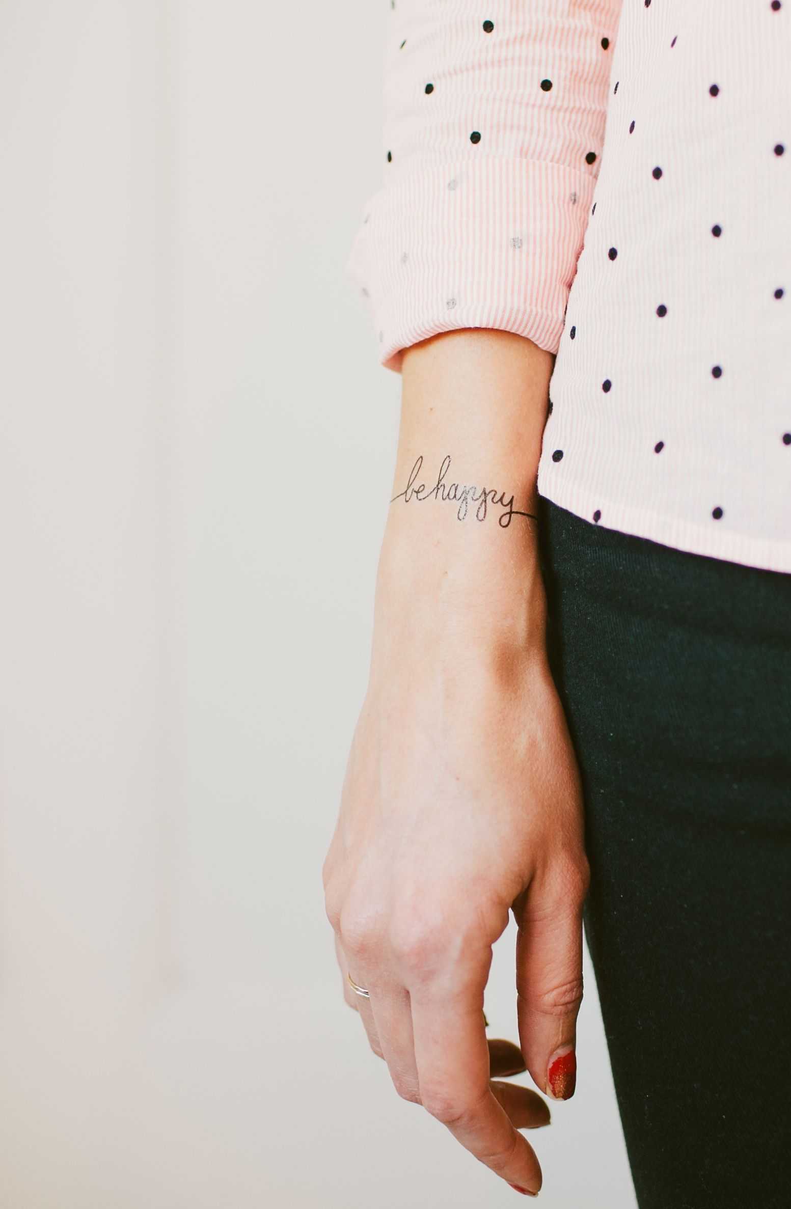 Иногда легкие женские тату на руке выполняются не обязательно в качестве рисунков. Самой простой надписью считается выражение «Be Happy», означающее «будь счастливой».