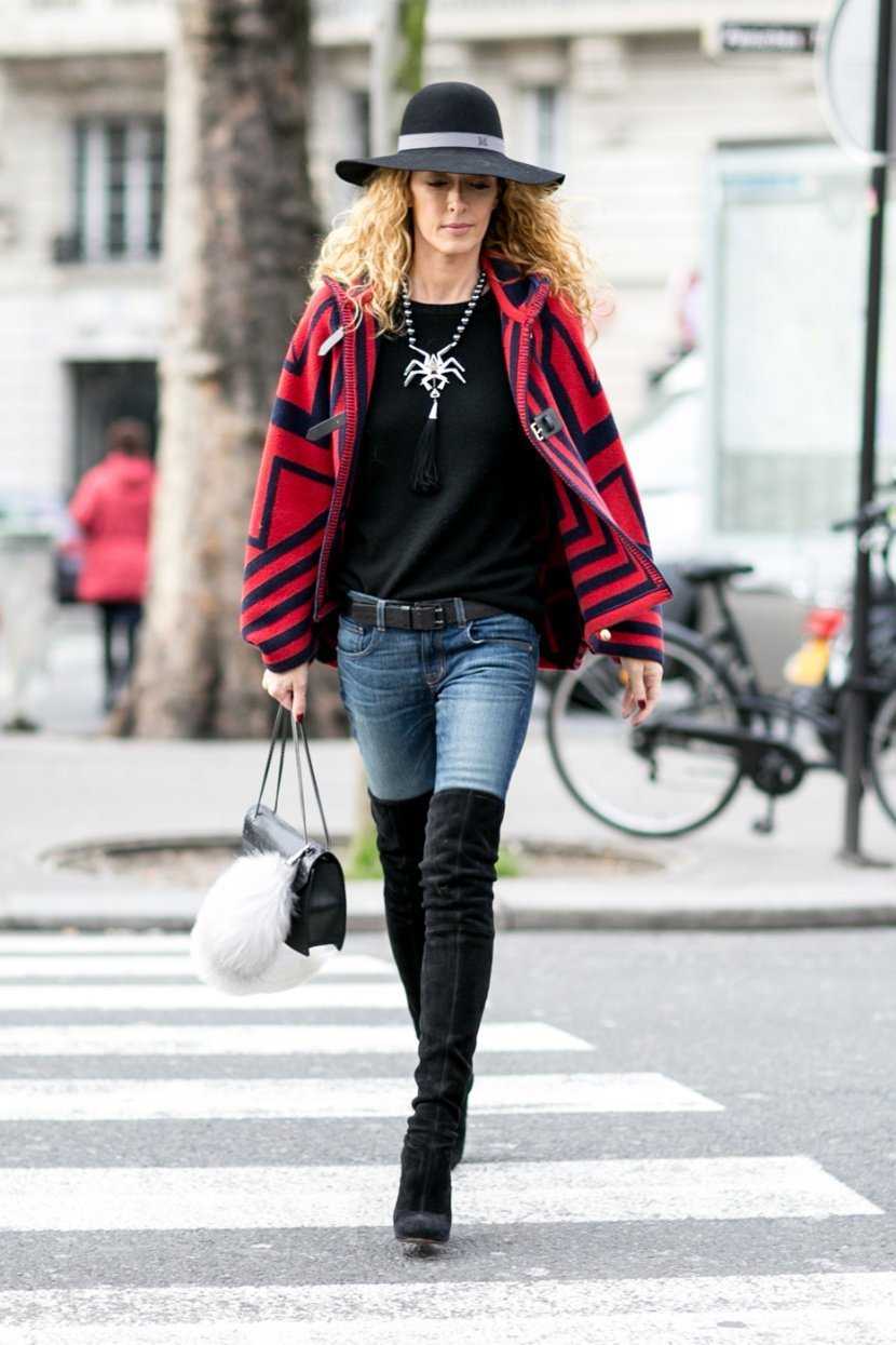 Не менее уместно сочетание синих замшевых сапог со шляпой в тон. Некоторым дамам такой вариант может показаться несколько вызывающим, однако он отличается оригинальностью и эффектностью. Еще один отличный пример сочетания – синие узкие джинсы и вязаный джемпер серого или бордового цвета.