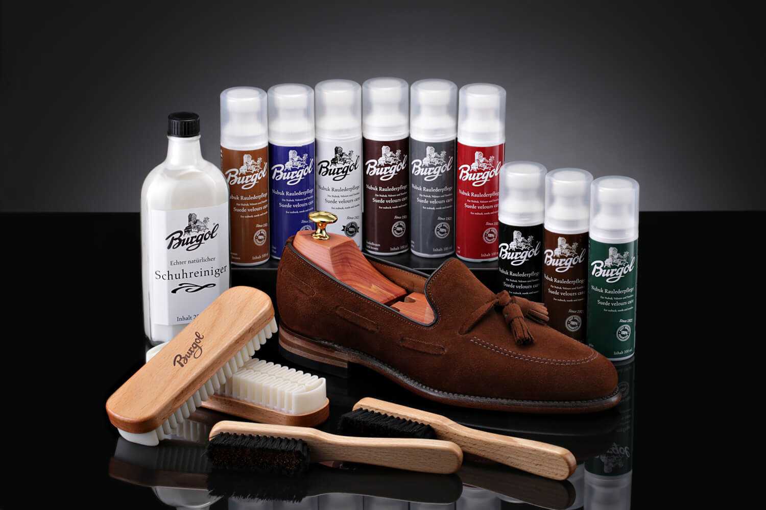 Для ухода предназначены специальные составы разных форм (спреи, шампуни, кремы), которые легко распределяются по поверхности замшевой обуви. Загрязнения хорошо удаляются при помощи щетки и обычного ластика. Ни в коем случае нельзя протирать замшу влажной салфеткой или тряпкой, потому что это только усугубит ситуацию, спровоцирует возникновение различных разводов, пятен. После очистки хранить обувь необходимо в сухом помещении, где нет воздействия влаги, яркого освещения, пыли.