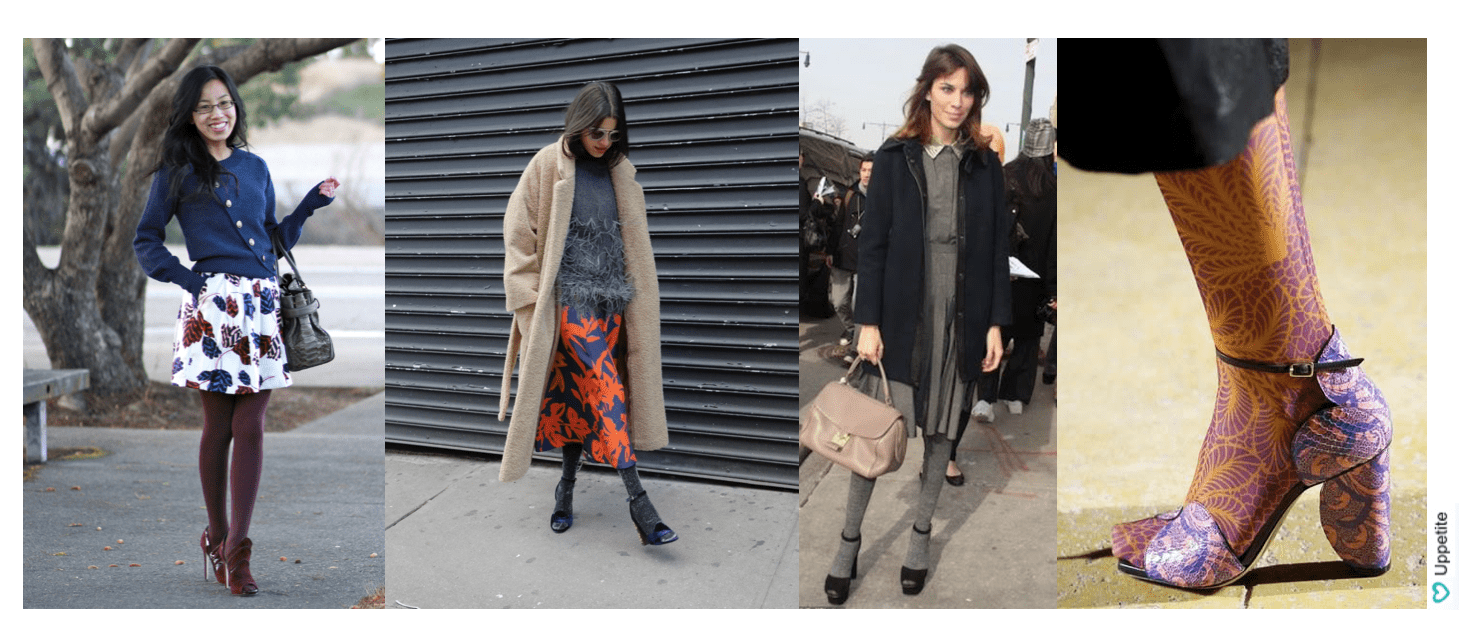 Обладательницы стройных ног могут смело экспериментировать с колготками, украшенным принтом, дополненными гольфами и даже гетрами.