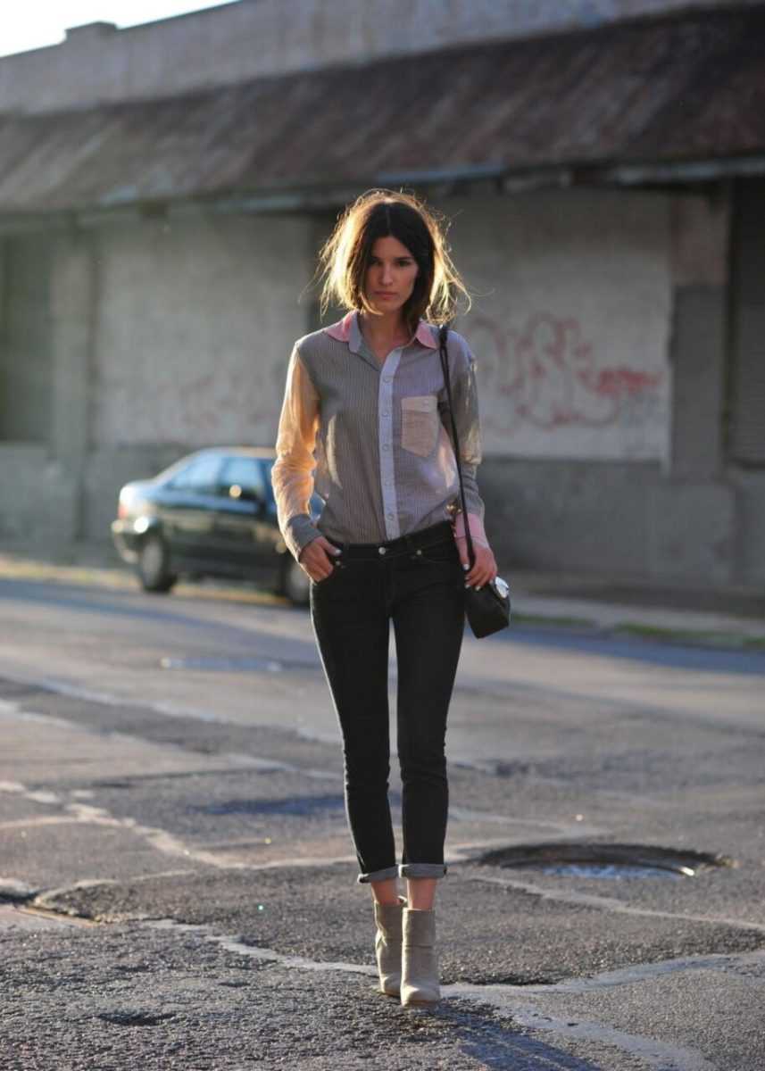 - Создать эффектный лук в стиле кэжуал можно с помощью джинсов и рубашки из денима или хлопка с рисунком в полоску или клетку.