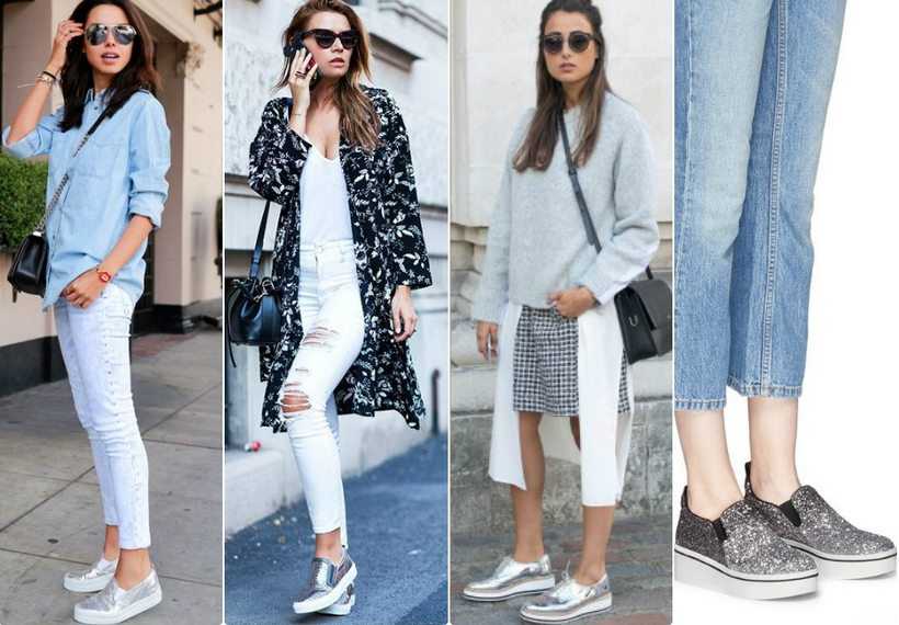 Для повседневной носки можно приобрести серебряные туфли на низком каблуке. Это могут быть балетки или лоферы. Такая обувь очень удобна, ее можно надевать с брюками, шортами, джинсами и платьями.
