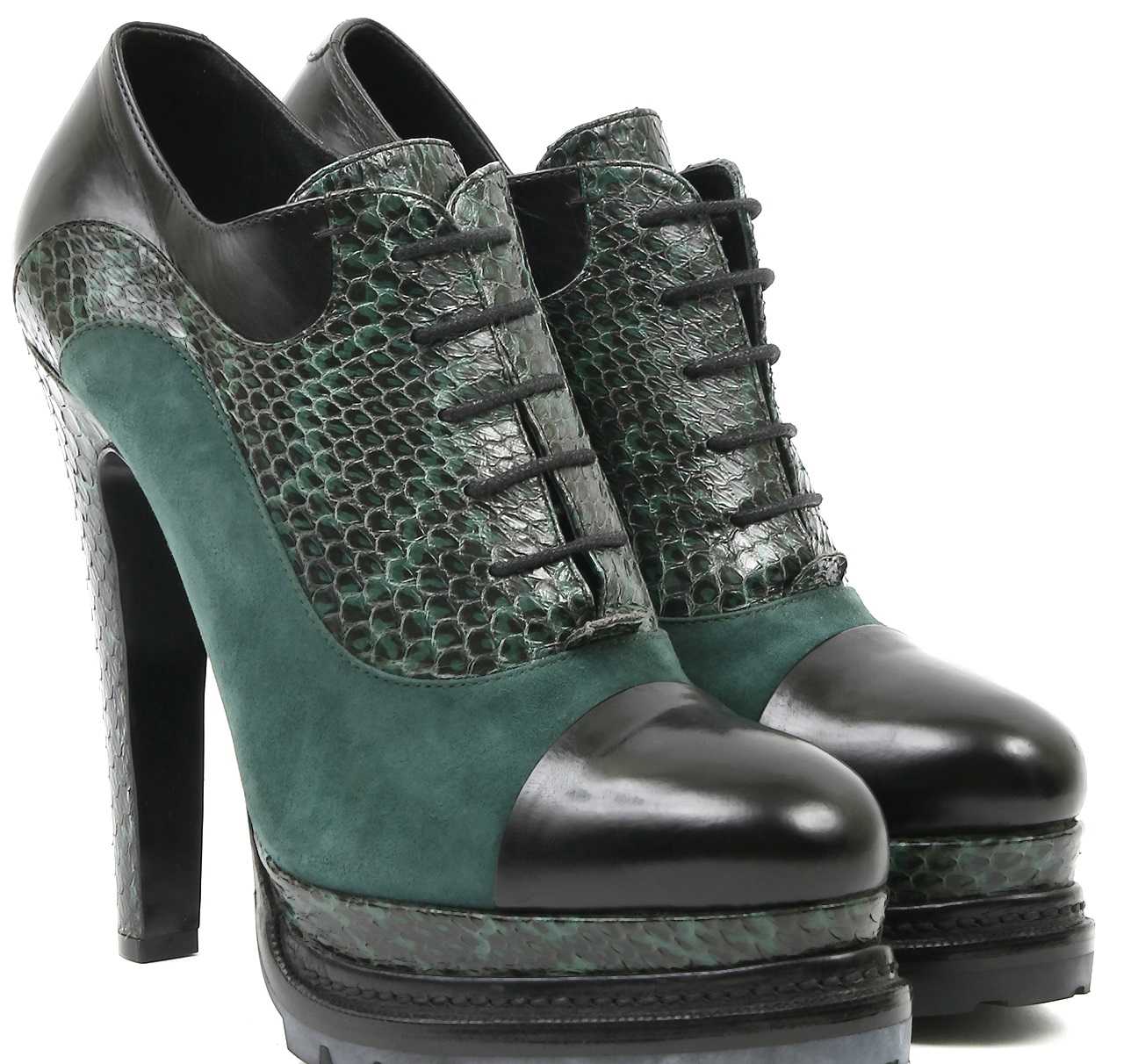 - Barbara Bui. Выполненные из натуральной кожи изделия сочетают в себе элегантность и шик. Обувь выпускается на каблуках в виде клина, наборных, широких, шпильках высоких и низких, на танкетке, платформе. Носки выполняются как закрытыми, так и открытыми. Для отделки зеленых моделей применяются мех, металлические элементы, детали из аналогичного материала, часто используются шнуровки.