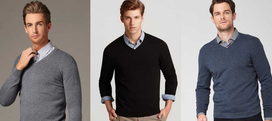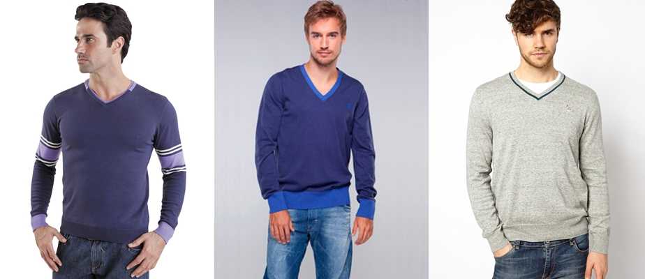 - V-образный. С таким вырезом можно выглядеть не только презентабельно, но и стройно. Угловой вырез зрительно удлиняет шею, и делает силуэт подтянутым. Его можно носить с галстуком на деловые встречи ил на работу в офис. Различаются такие свитера по глубине выреза. Излюбленный вид свитера для сторонников стиля смарт-кэжуал.