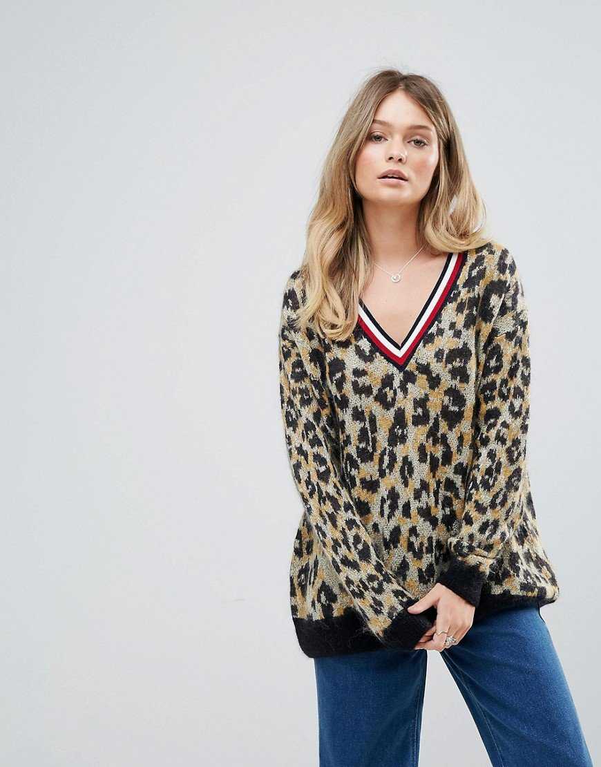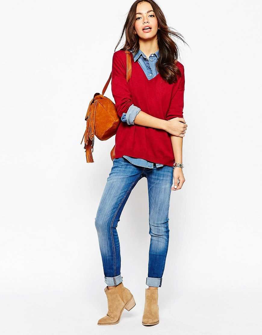 Под свитер можно надеть футболку или лонгслив, рубашка в этом случае будет неуместной, так как её воротник будет мешать. Поверх толстого свитера можно надевать куртку, полупальто или стеганый жилет. Низ ансамбля представлен джинсами или брюками свободного стиля.