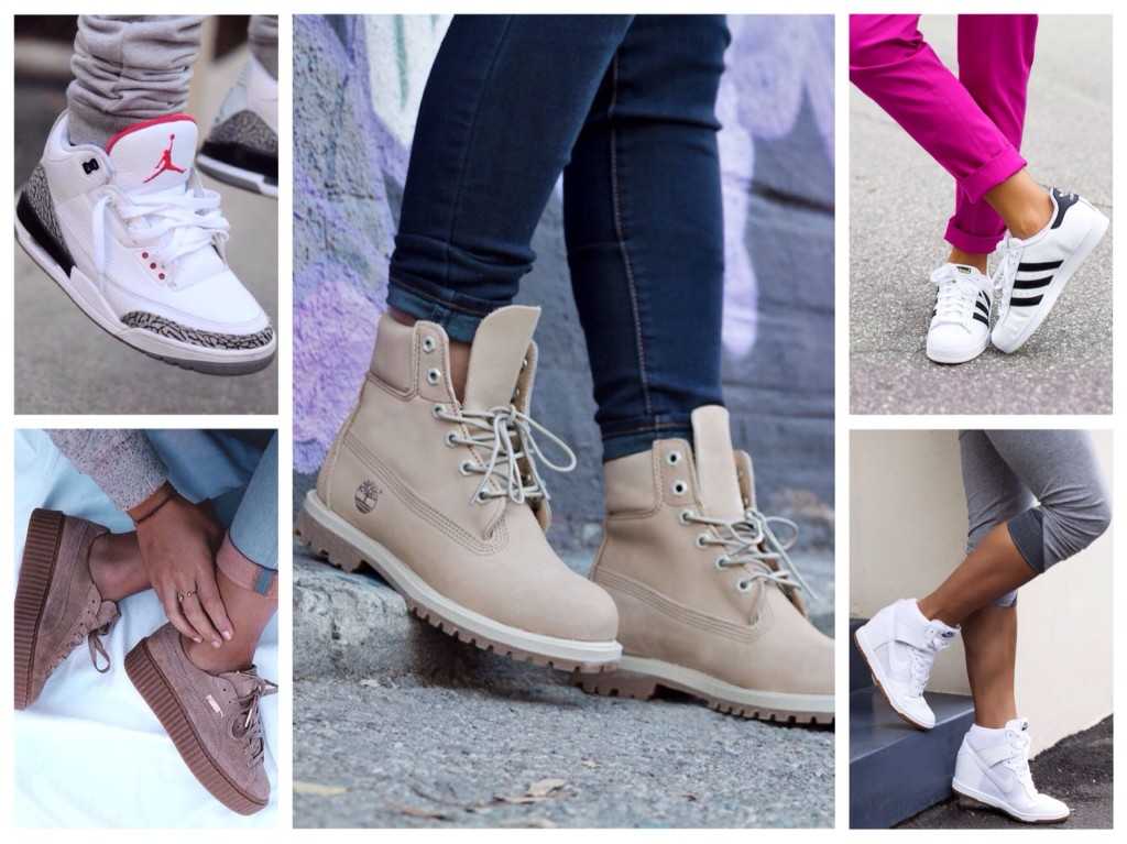 — Выбирайте комфортную обувь актуального дизайна — яркие сникерсы, кеды, кроссовки на платформе, слипоны, топсайдеры. В холодное время года — ботинки в стиле Timberland (такие, как на следующем фото) или высокие кроссовки.