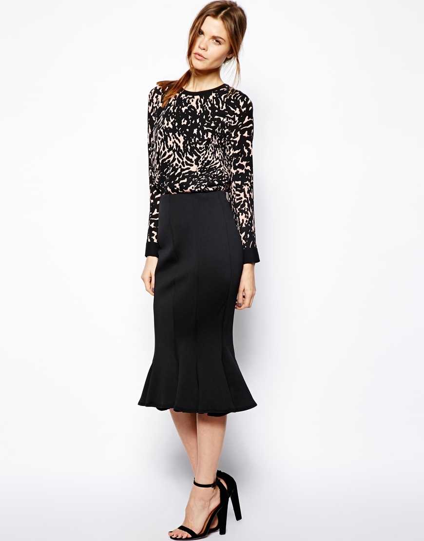- Миди требует обтягивающую водолазку, небольшой жилет, легкий джемпер, туфли на платформе, либо классические «лодочки».