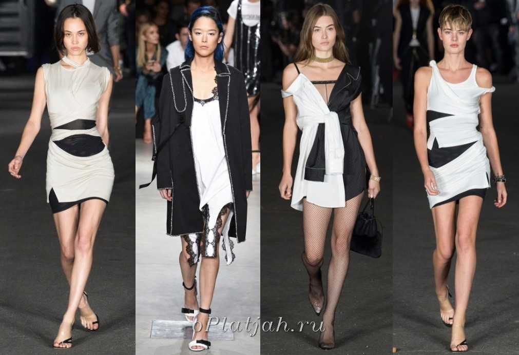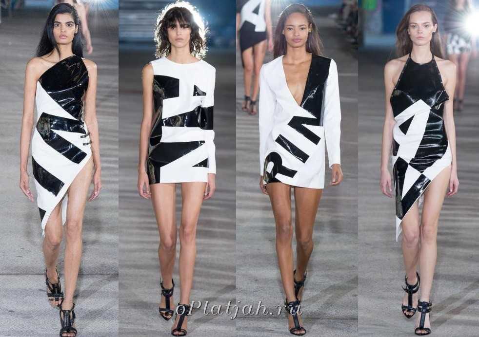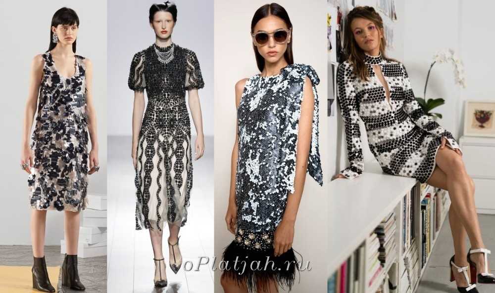 Глэм, блеск или фасоны в стиле диско — это черно-белые платья, расшитые сверкающими пайетками. Эта тенденция вот уже несколько сезонов не покидает большие подмостки во время показов коллекций и будет характерной для женских одежд разного предназначения.