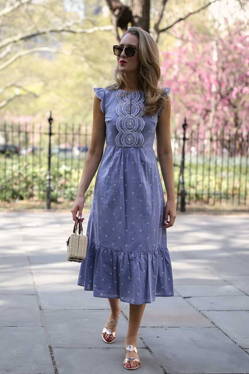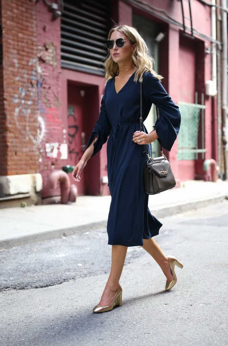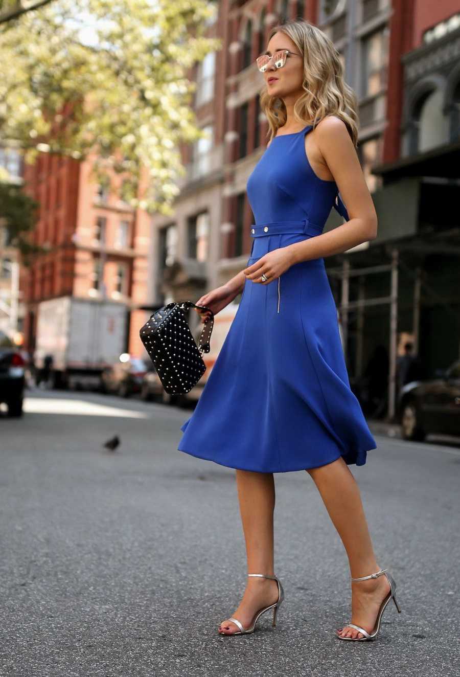 Если у вас платье-футляр, то наденьте укороченный синий пиджак и туфли-лодочки.