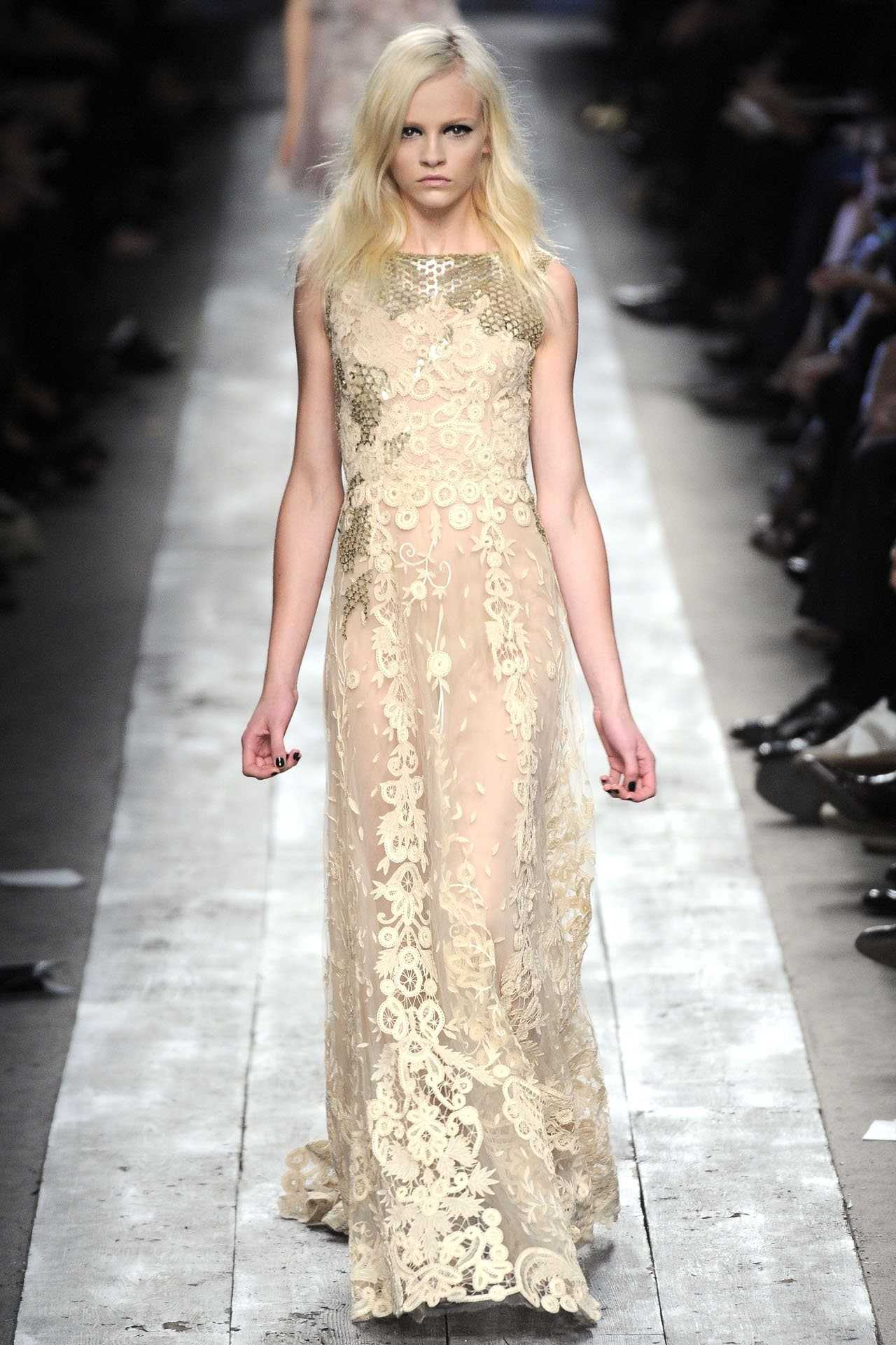 Сотканное будто из прозрачной паутины, модное бежевое платье Christian Dior повинуется малейшему дуновению ветра и чутко реагирует на каждый шаг. Верхняя часть лифа из ткани светлого нюдового оттенка сливается с цветом кожи и создает иллюзию полного ее отсутствия. Разбросанные по полю ромашки придают образу налет романтичности.