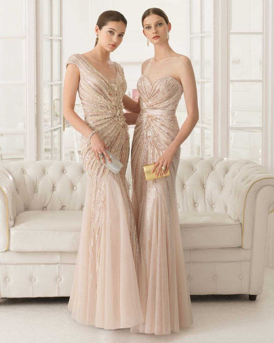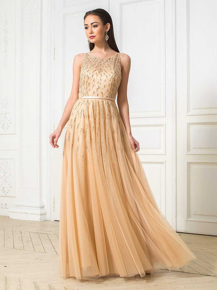Вечерние платья в золотисто-бежевой гамме всегда пользовались популярностью. Такие наряды можно увидеть на самых разных мероприятиях от торжественного светского раута до молодежной вечеринки. Чтобы платье не выглядело скучным, его декорируют вышивкой, паетками, стразами. Сшить наряд можно из шелка, атласа или кружева. В комплект к такому платью стоит подобрать вечерние туфли на каблуке и нарядный клатч.