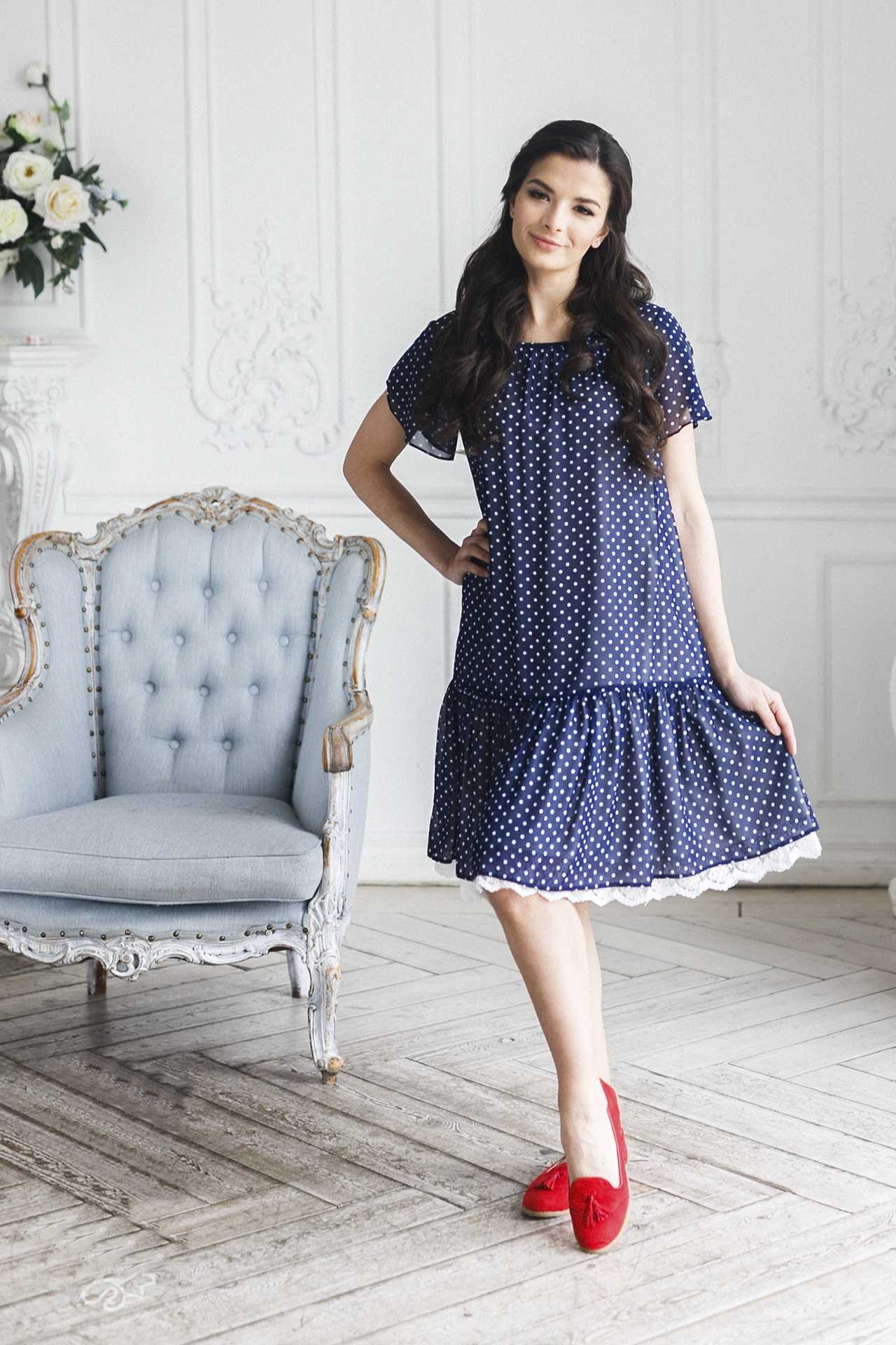 Помимо главного цвета, рисунки платьев различаются многообразием оттенков. Чёрный горох на белом сарафане — классический стиль для летнего сезона. Дополнить лёгкостью прогулочный образ смогут светлые босоножки. Если вы выбираете наряд для романтического свидания, ножки могут украсить очаровательные туфли лодочки чёрного цвета.