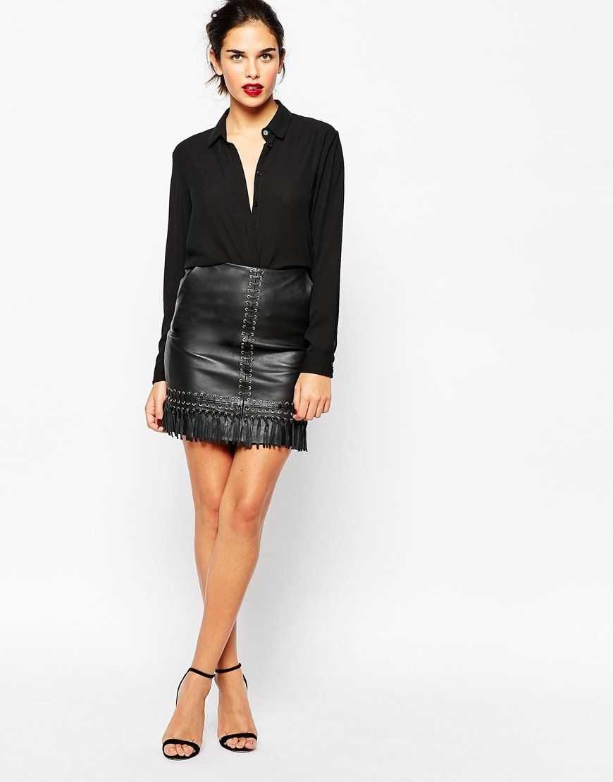 Кожаное мини может оказаться в образе на вечеринку. В этом случае кожа может быть глянцевой и с металлическим декором.