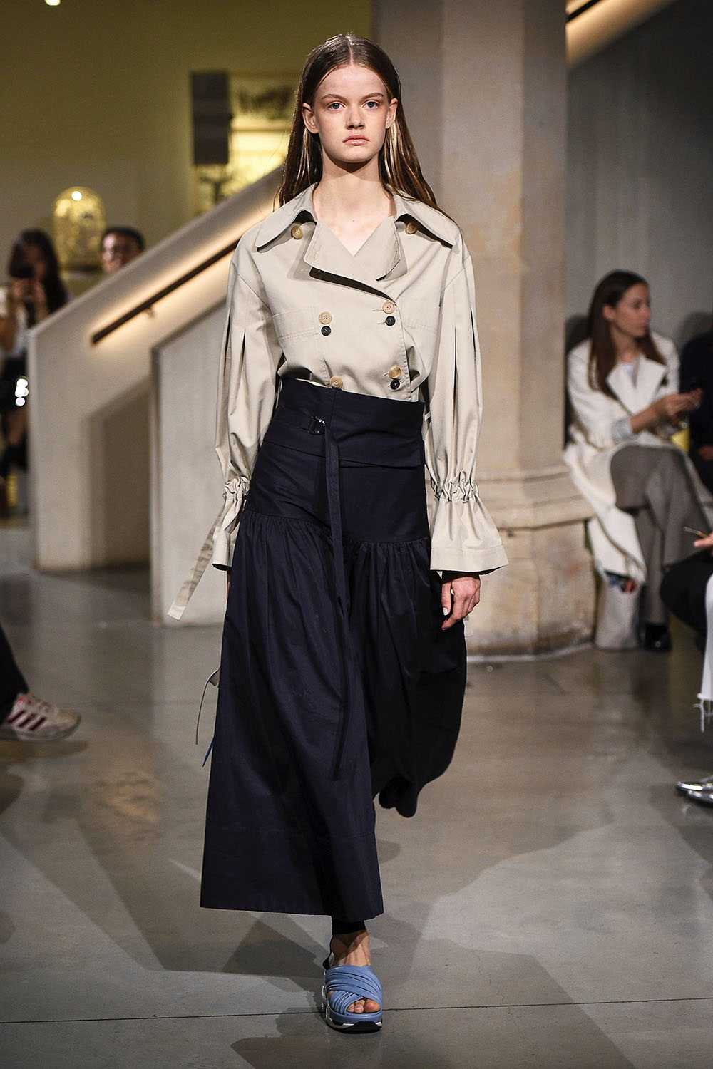 Весной в юбках «в пол» актуальна так же чуть заниженная, отделанная кокеткой, линия талии. Её в этом сезоне подчеркивают с помощью демонстративно «тяжелых» ремней с крупными декоративными пряжками. Это вариант идеально сочетается с вернувшимися в моду укороченными – выше линии талии топами.