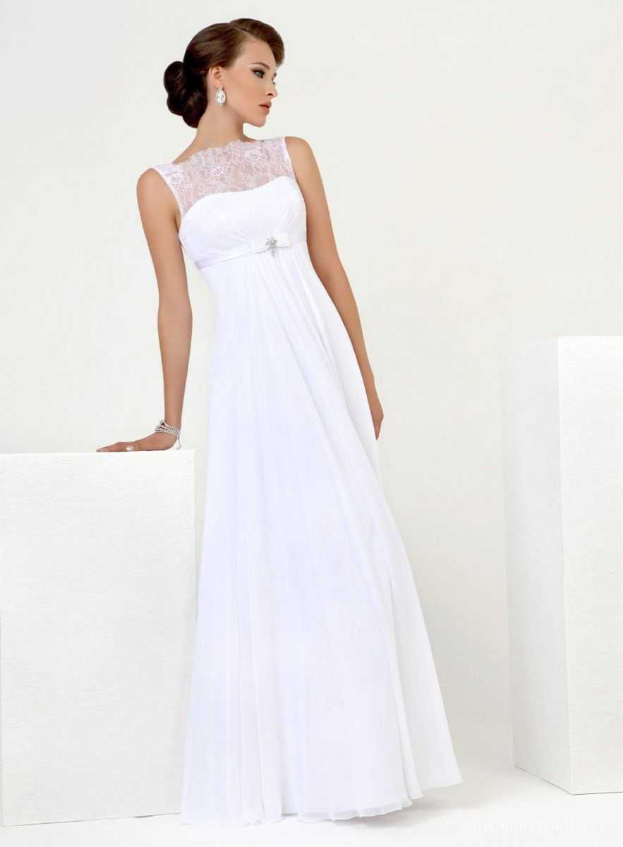 В греческом стиле. Для этого кроя характерна высокая талия и легкие ткани. Фасон часто имеет глубокое декольте. Нежные материалы отлично драпируются, помогая скрыть животик.