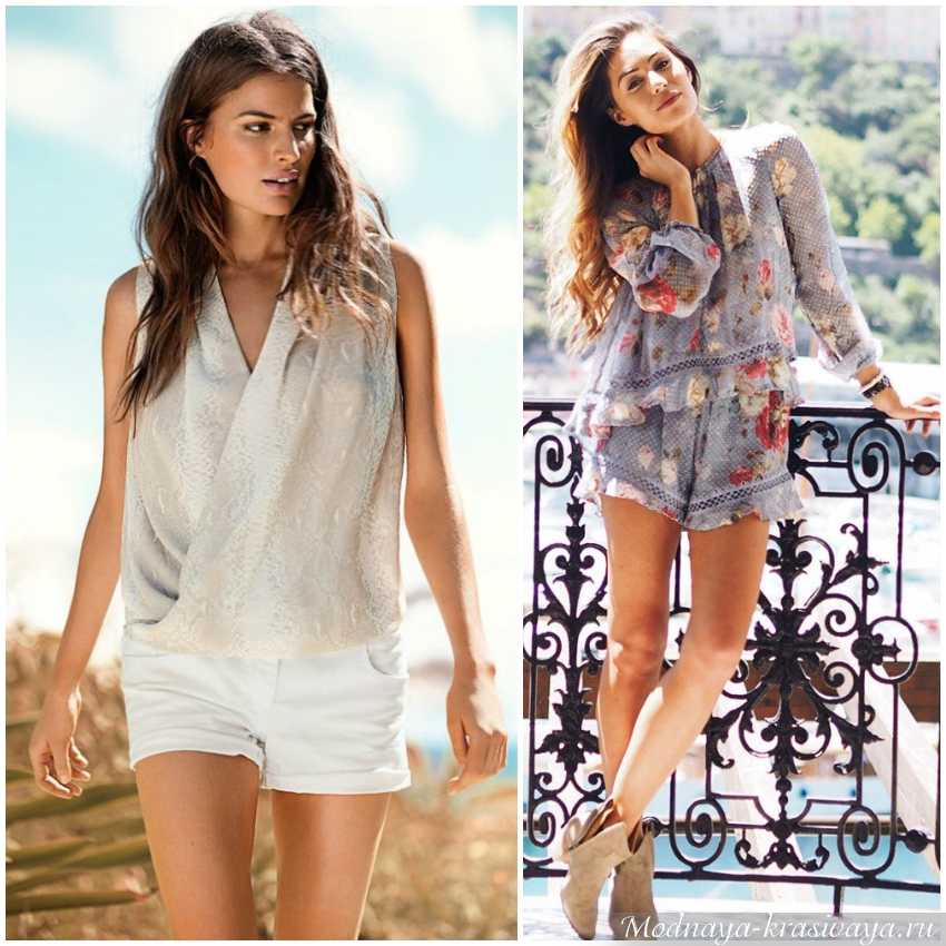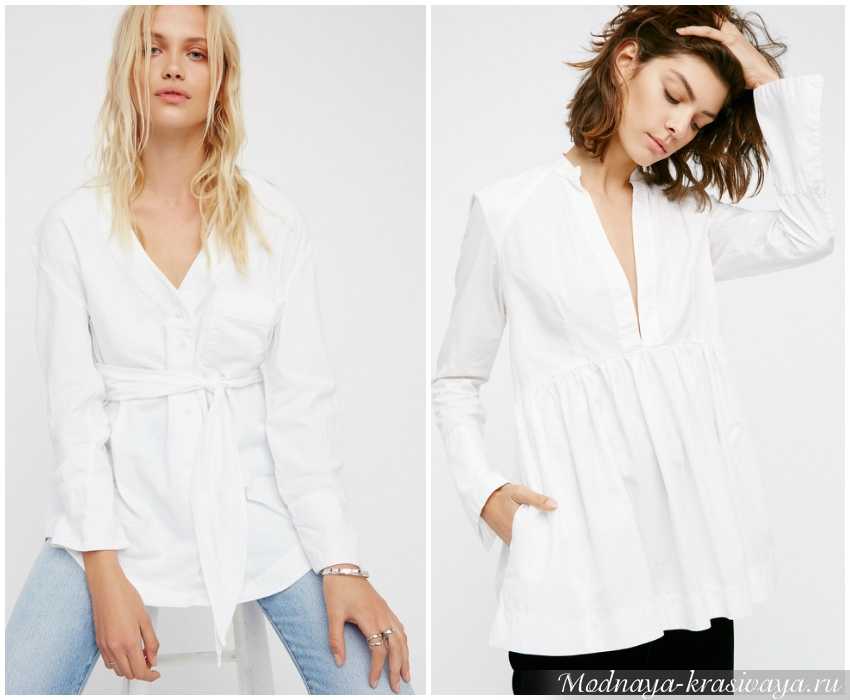 - Выбор блузки не нужно останавливать на рубашках оверсайз или выбирать модели максимально свободного кроя. Отлично подойдут топы, обладающие V-образным вырезом, актуальными будут модели с оголенными плечами.