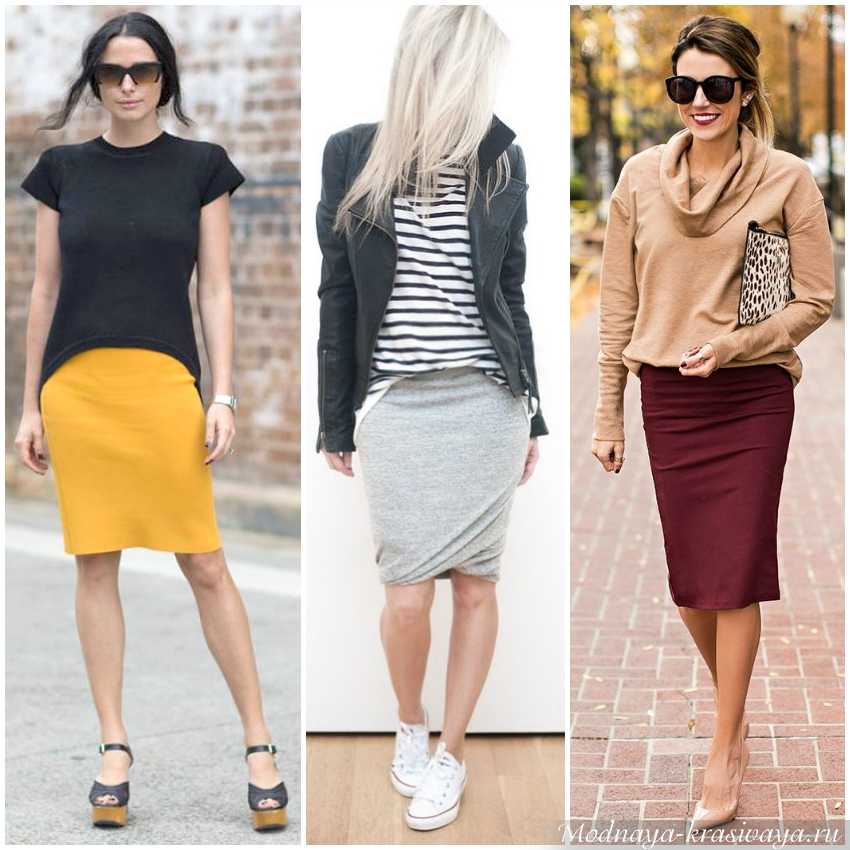Также с юбкой-карандаш можно носить топ А-фасона, т. е. расширяющийся книзу — это тоже создает дополнительный объем на бедрах.
