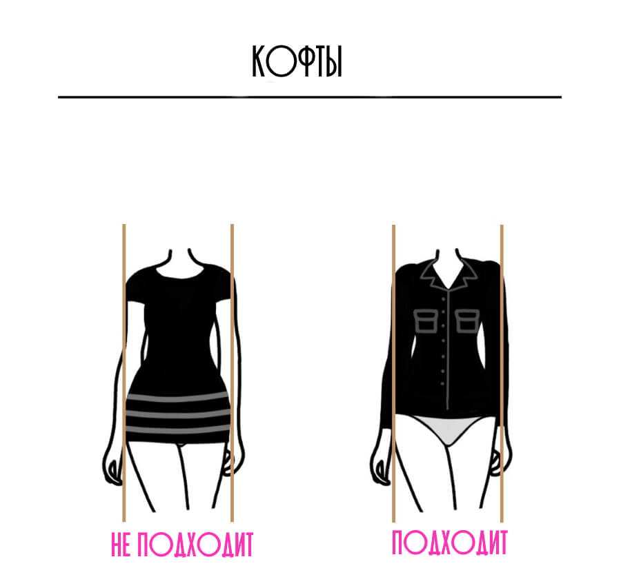 Еще очень важно выбирать топы, свитера, рубашки и жакеты длиной ниже талии