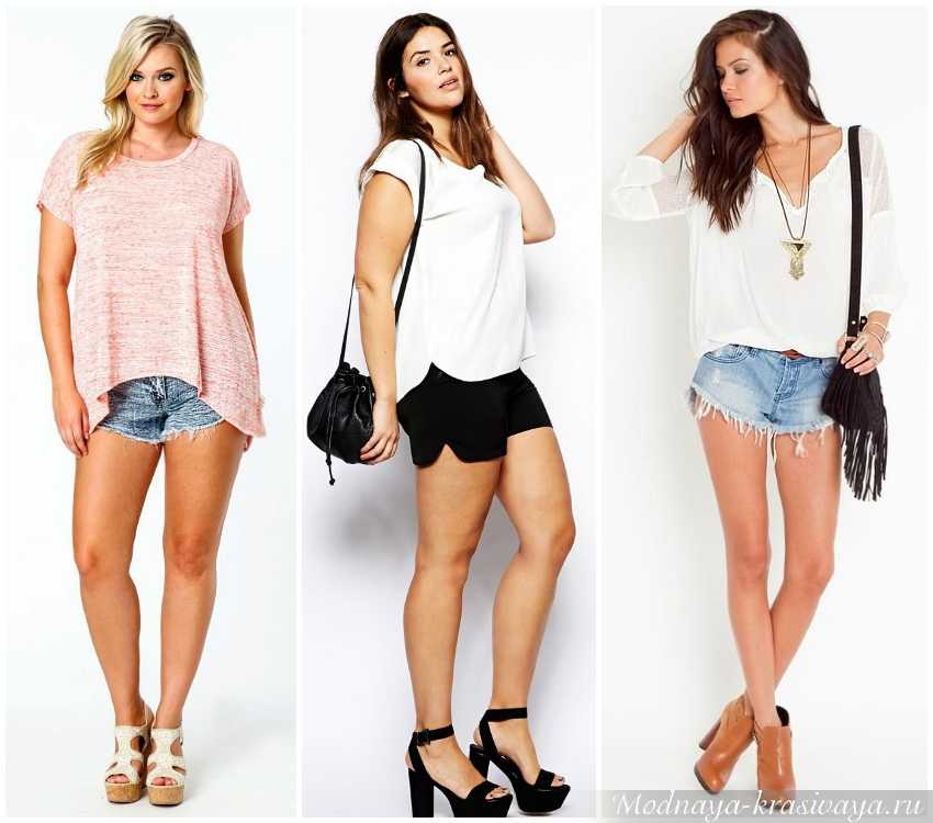 Топы и футболки. Выбирайте футболки своего размера с плечевым швом, строго проходящим по границе плеч. Топы, выполненные в более темных тонах, чем юбка или джинсы, уменьшат объем верхней части тела. Их лямки должны быть строго посередине плеча.
