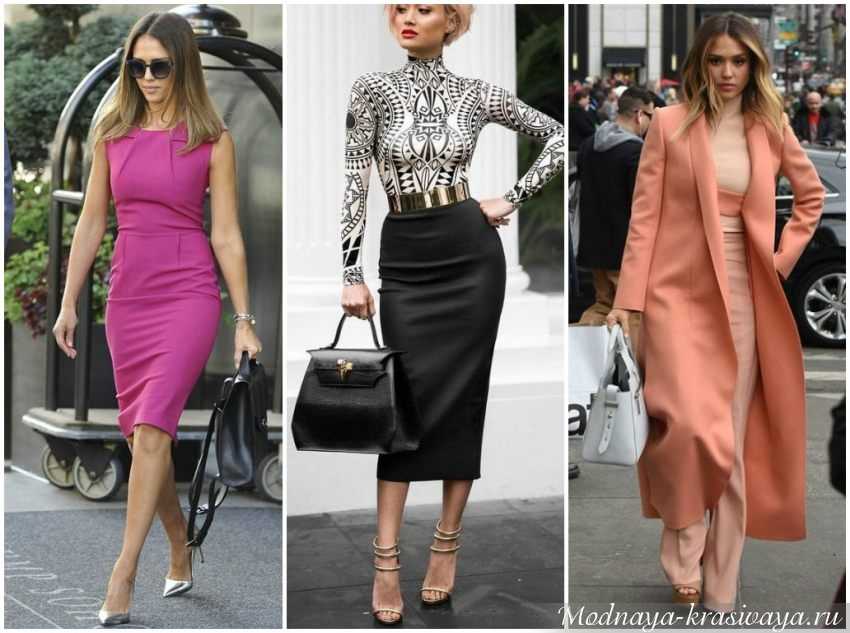 - Футляр. Отличный вариант, делающий акцент на талии. Если имеются полные ноги, лучше не выбирать наряд, слишком облегающий нижнюю часть тела. В противном случае бедра будут казаться еще шире.