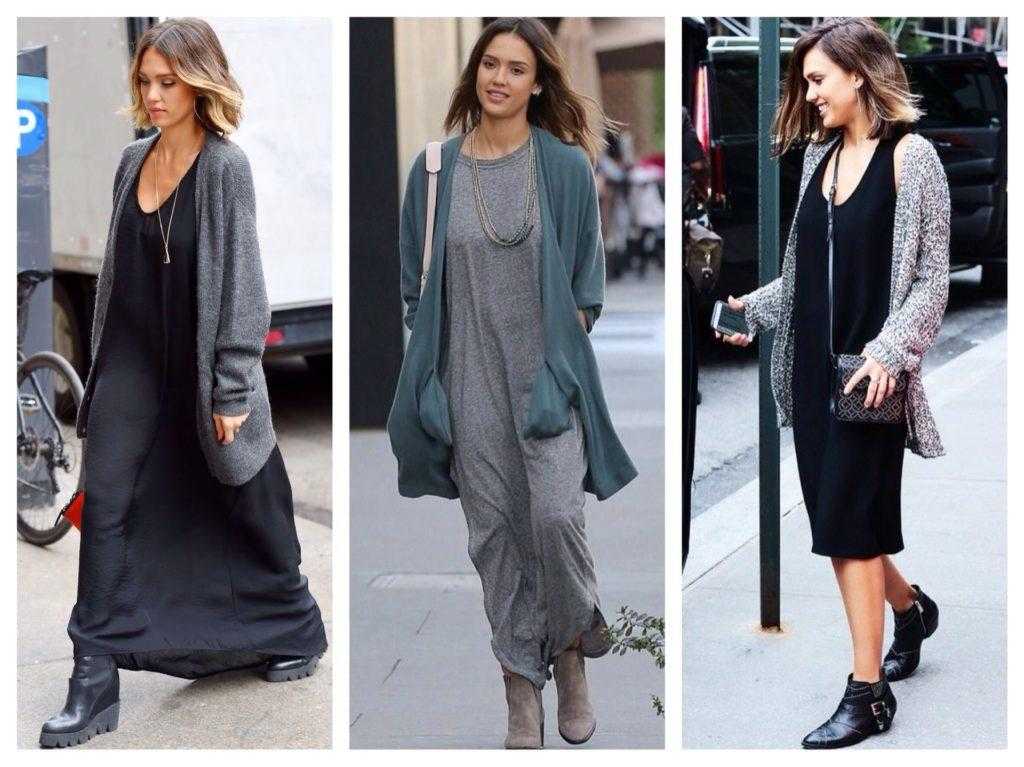 Подобные женские фасоны особенно оригинально смотрятся или с очень длинным, или, наоборот, с коротким. Стильно выглядит и контраст между цветами в ансамбле. Длинное черное платье в пол украсит светлая модель. А под черный кардиган можно надеть белую рубашку. Платье на осень дополнит кардиган из трикотажа, это очень уютное решение для прохладной погоды.