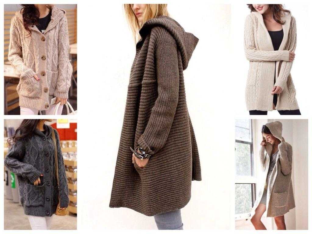 Актуален сейчас и свободный кардиган оверсайз, как видно на фото. В подобном изделии очень уютно, часто можно увидеть варианты без пуговиц, к тому же оно замечательно подчеркнет хрупкость модницы. Особенно если нижний слой будет облегать фигуру. Это может быть как платье, так и топ с брюками. Этот же прием используют и для свободного пальто. Цвет такой верхней одежды лучше выбирать нейтральный — серый или бежевый. В летнее время актуален кардиган из трикотажа, в том числе и без рукавов. Можно подобрать интересную модель с капюшоном.