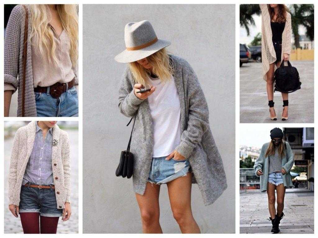 Короткие джинсовые шорты можно комбинировать с верхом, который их закрывает, примеры на фото. Чтобы образ был еще более уютным, можно подобрать вариант с капюшоном. С наступлением первых холодов кардиган часто используют вместо пальто или кейпа. Выбирают для этого теплые, вязаные модели. Носят их вместе с брюками или джинсами, в качестве обуви подойдут ботинки.