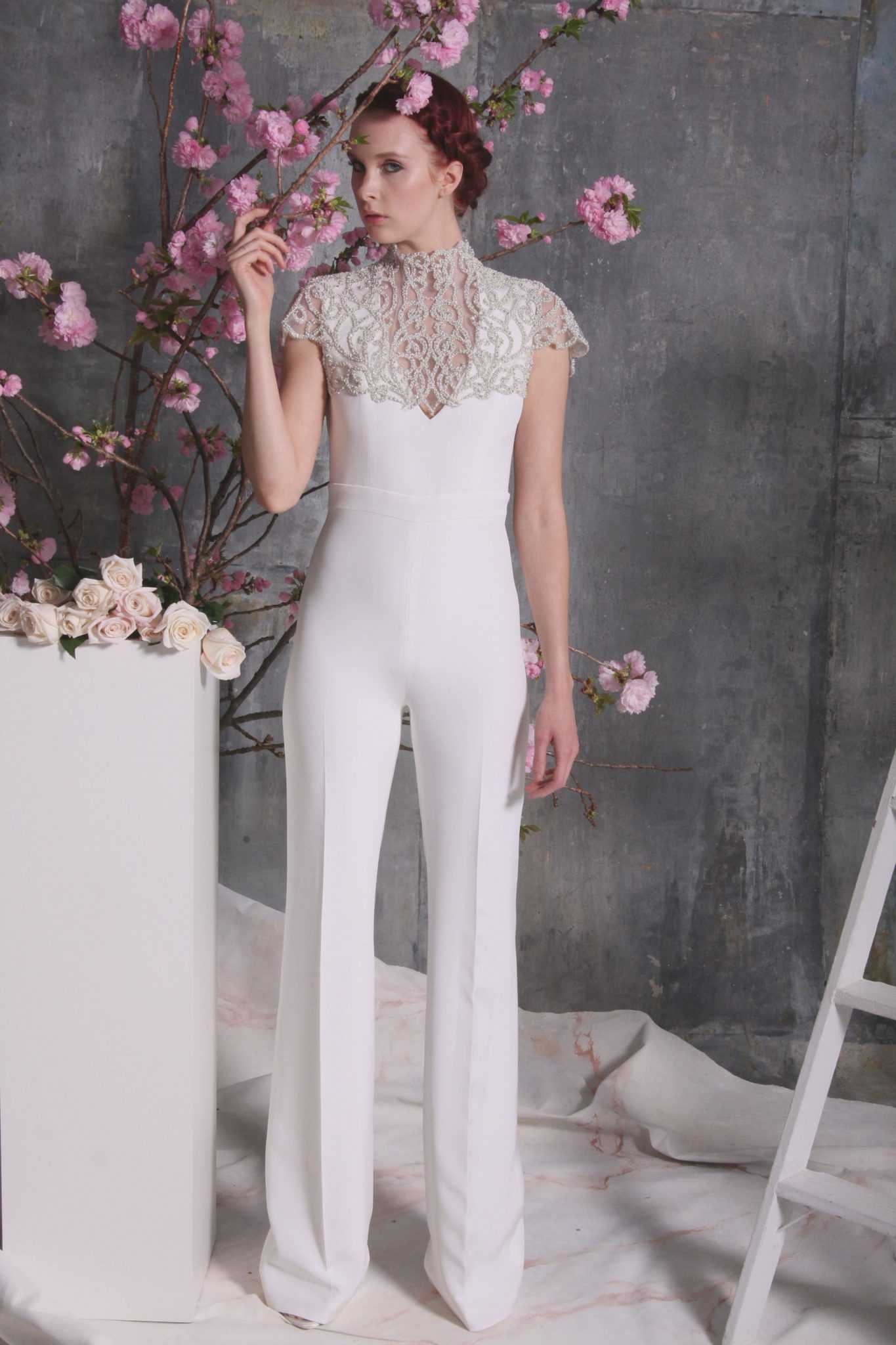Свадебные комбинезоны шьют из легких тканей, декорируют кружевом, бусинами, бисером, стразами. В основном это сдержанные расклешенные модели. Нижняя часть может дополняться легким шлейфом. Популярен длинный и короткий рукав, оригинально смотрятся асимметричные комбинезоны на одно плечо.
