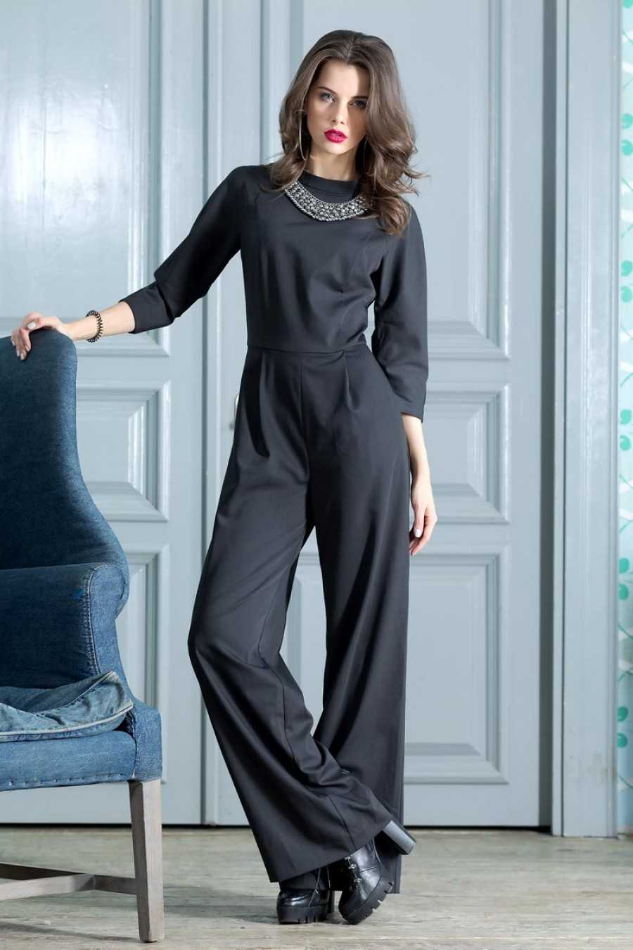 платье-комбинезон. Оригинальный вариант, удивительным образом совмещающий в себе как платье, так и брючный фасон. Смотрится данная вещь очень стильно и необычно, а темный оттенок такого предмета подойдет даже пышным барышням, делая фигуру более пропорциональной и изящной;