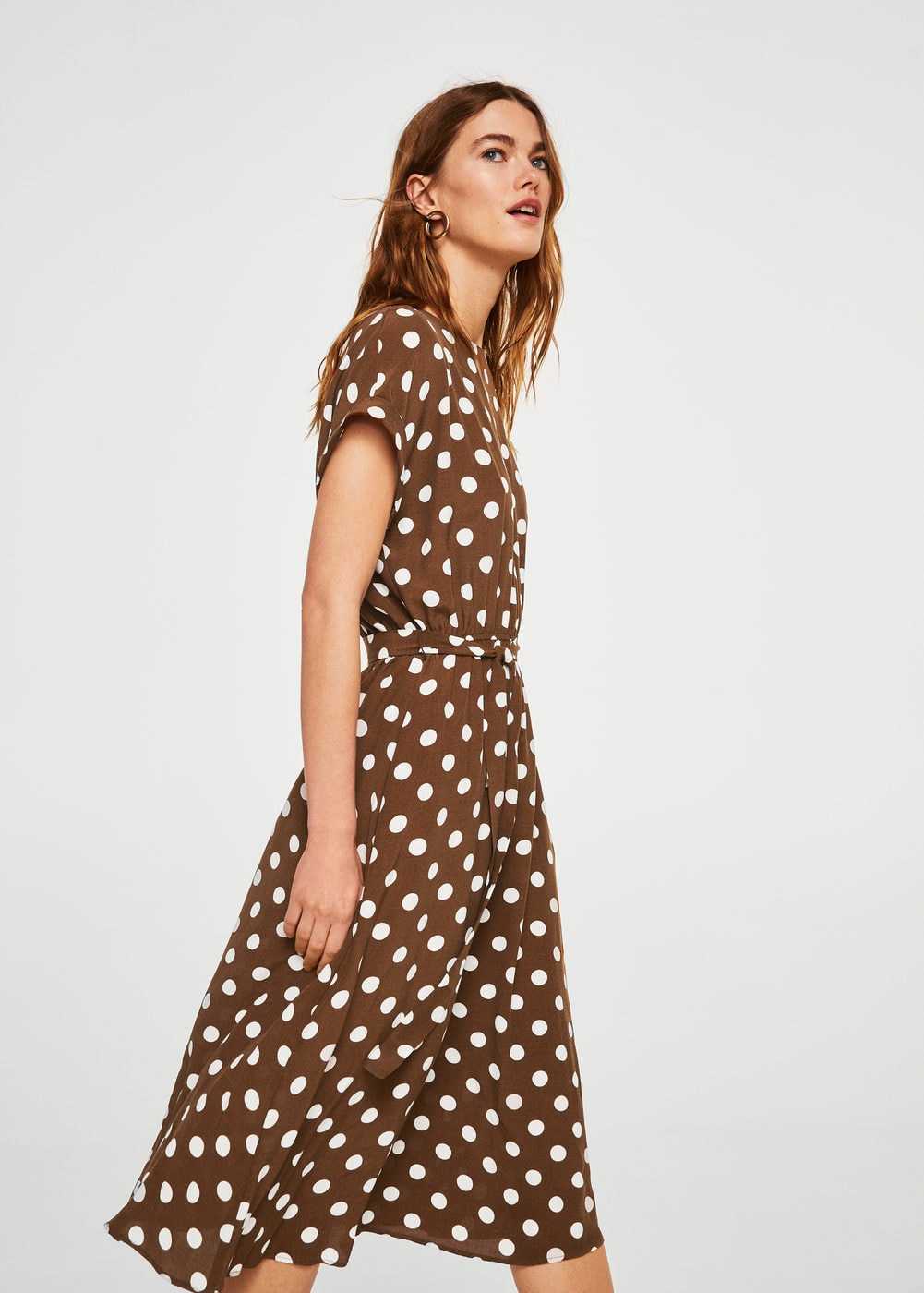 Для создания романтического образа подойдет женственное коричневое платье в мелкий белый горошек. Такой фасон был популярен в 50-х годах, когда девушки шили себе великолепные наряды с широкой расклешенной юбкой, открытой спиной, перекрестным лифом и широкими бретельками.